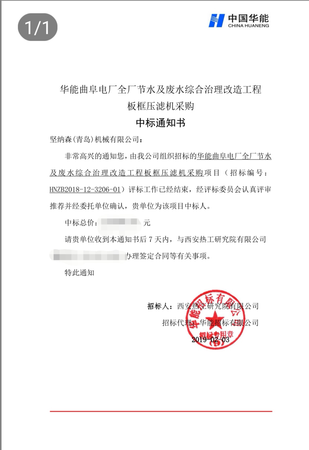 2019年2月3日(臘月二十九),春節(jié)前的最后一個工作日,堅納森(青島)機械有限公司,收到西安熱工研究院有限公司頒發(fā)的:《華能曲阜電廠全廠節(jié)水及廢水綜合治理改造工程板框壓濾機采購》中標通知書。