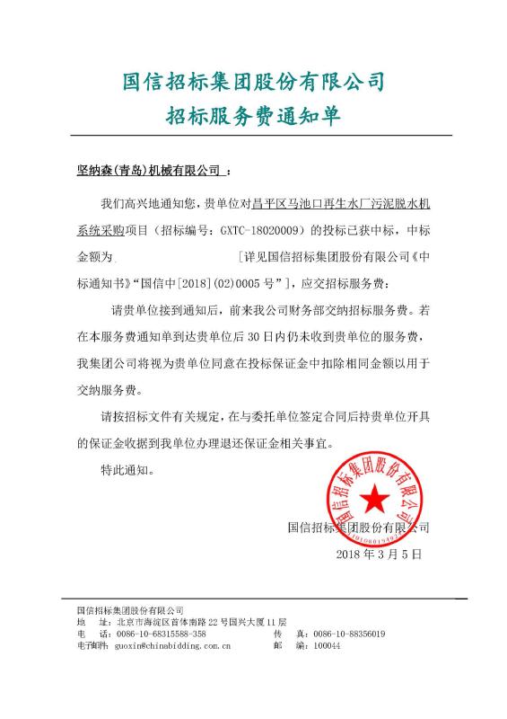 堅納森中標昌平區(qū)馬池口再生水廠污泥脫水機系統(tǒng)采購項目